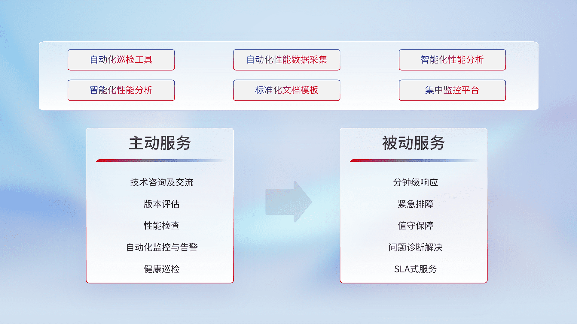 智能化工具和标准化文档,,,保障服务质量,,提供主动服务(包含技术咨询、、、版本评估、、、性能检查、、自动化监控与告警、、、健康巡检)和被动服务包含(分钟级响应、、、紧急排障、、、值守保障、、、、问题诊断解决、、、、SLA服务)。。。